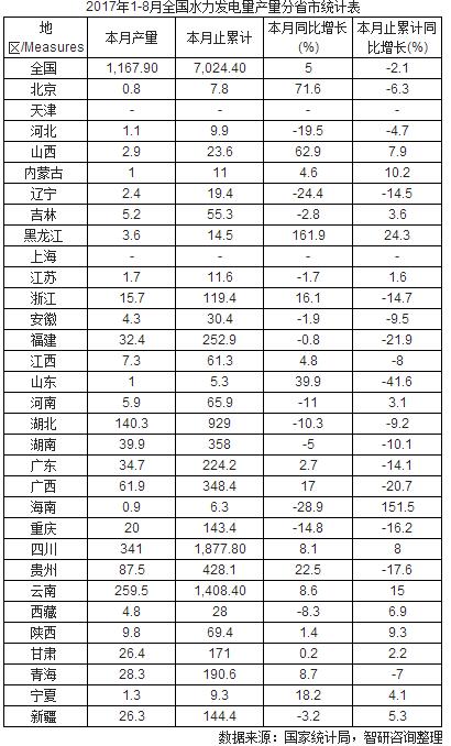 2017年1-8月全國水力發(fā)電量產(chǎn)量分省市統(tǒng)計(jì)表2017年8月中國水力發(fā)電量產(chǎn)量為1,167.90億千瓦時(shí),同比增長5%;2017年1-8月止累計(jì)中國水力發(fā)電量產(chǎn)量為7,024.40億千瓦時(shí),同比下降2.1%。